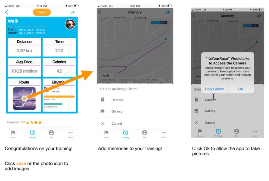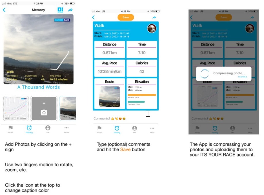 • Once finished, you can add photos from your run or walk and SAVE a screenshot of your training to share